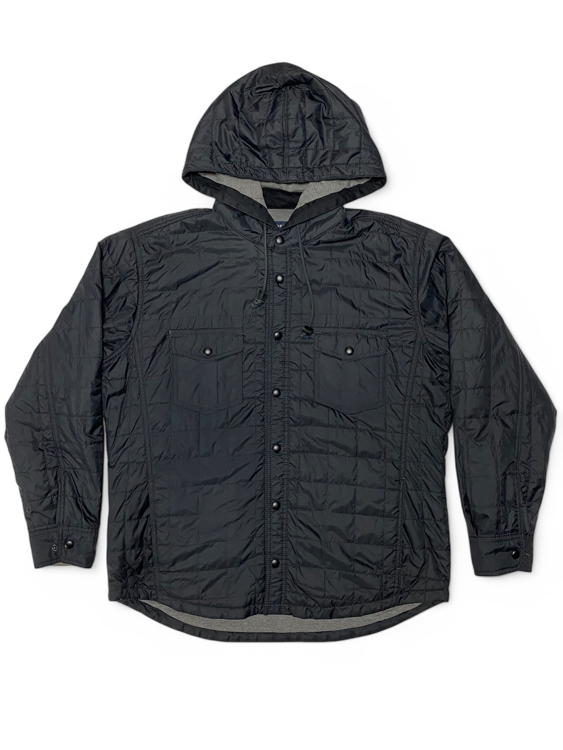 キルティングシャツにフード付き。ネルシャツにフードが付いたものは見かけますが、キルティングは珍しいと思います。