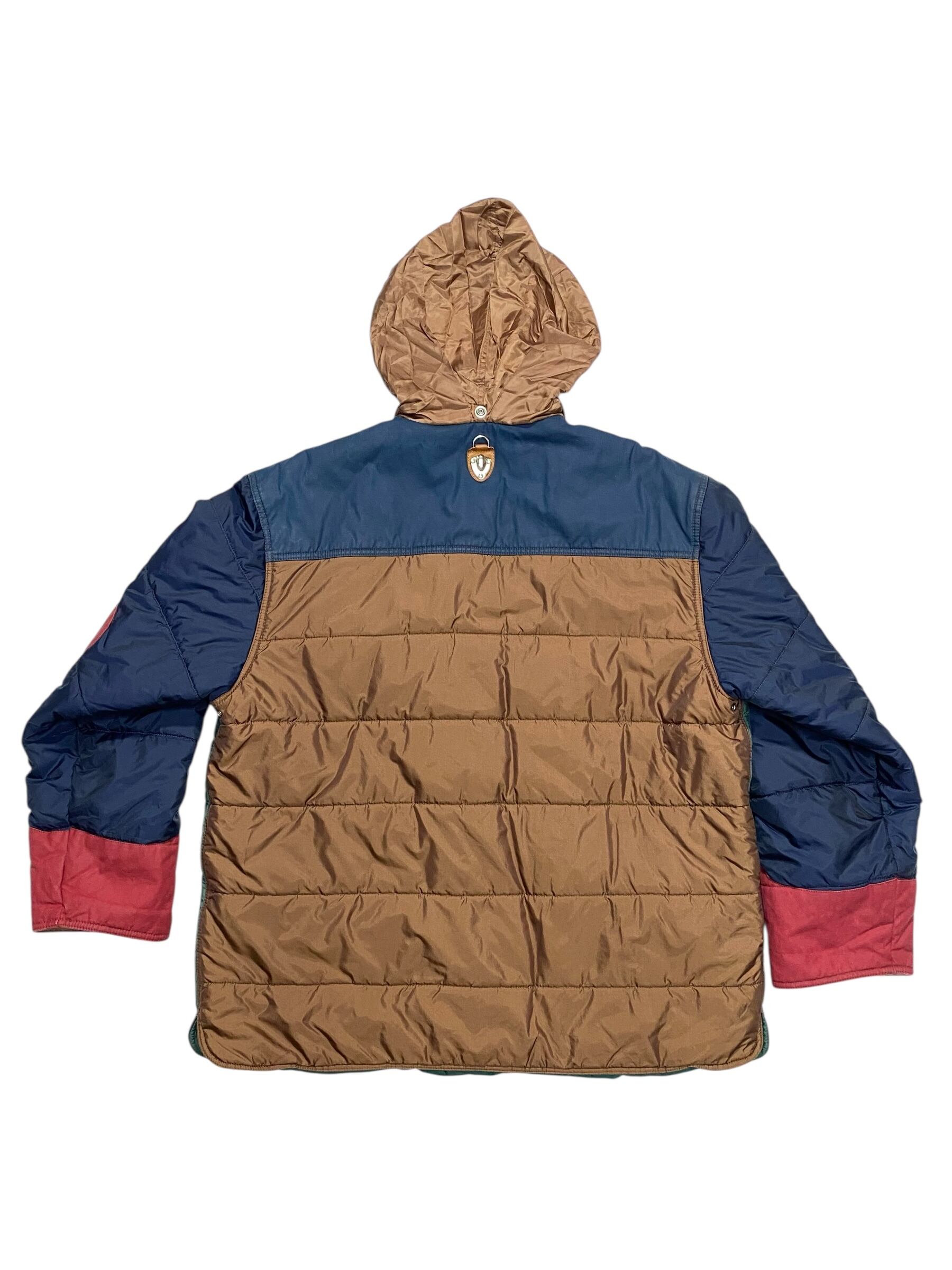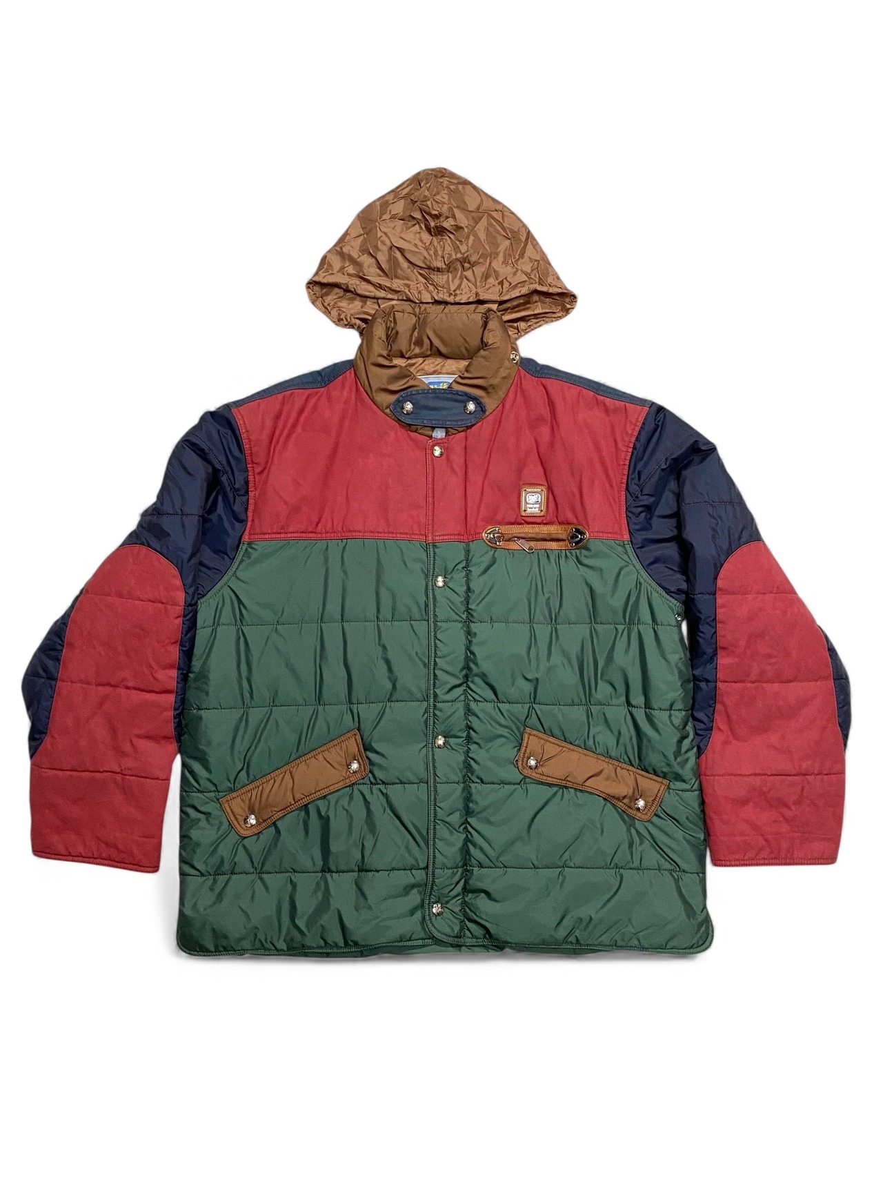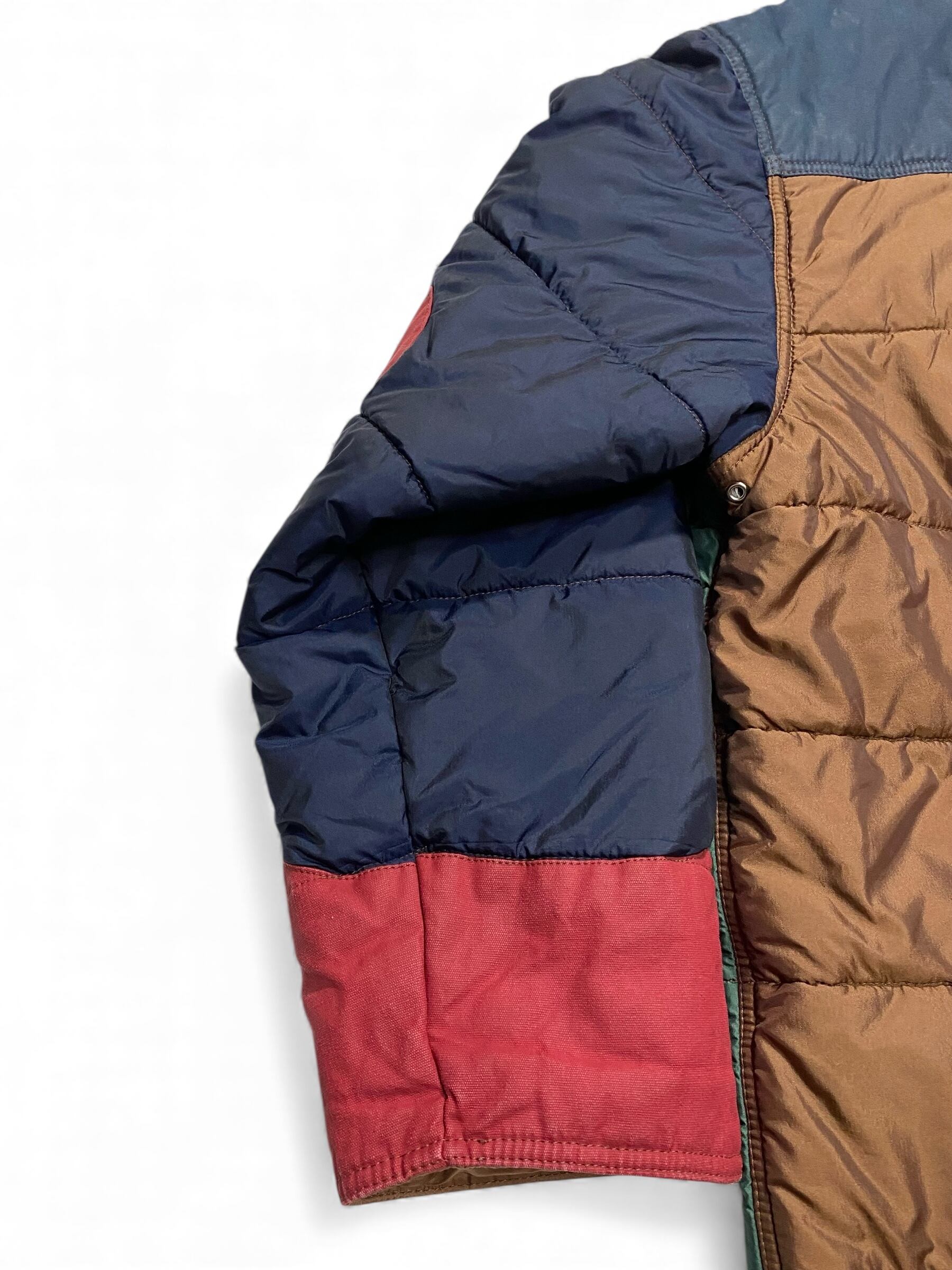ナイロンとコーティング加工されたダック地の切り替えしになっていて、そこに個性的ななデザインの金具が付いてます。一応簡易的なフーディーも付いてます。